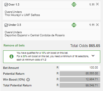 Booking code U166702AC37 LEG – 865 ODDS – R100 PAYS R99 500