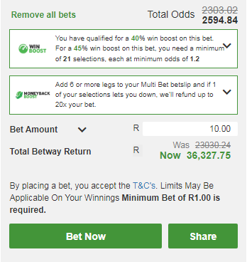 Combine several legs (Accumulator) to get higher combined odds and a bigger payout, more legs = more risk!